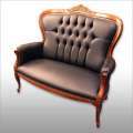 シックでありながら存在感に気品を感じるアーティフィシャルレザーのブラックラブソファです。当店でも最も人気が高いチェアのひとつです。
