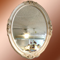 オフホワイトのオーバル(卵型)ウォールミラーです。上下左右のワンポイント彫刻が、シンプルなのでお部屋のイメージにすっと溶け込みます。